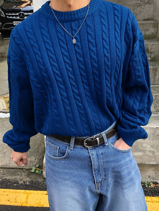 Autumn/Winter Unisex Street Style Drawstring Cable Knit Twisted Pattern Couple's Knit Sweater, Casual Loose Fit Crew Neck Fashion Drop Shoulder Long Sleeve Pullover Top