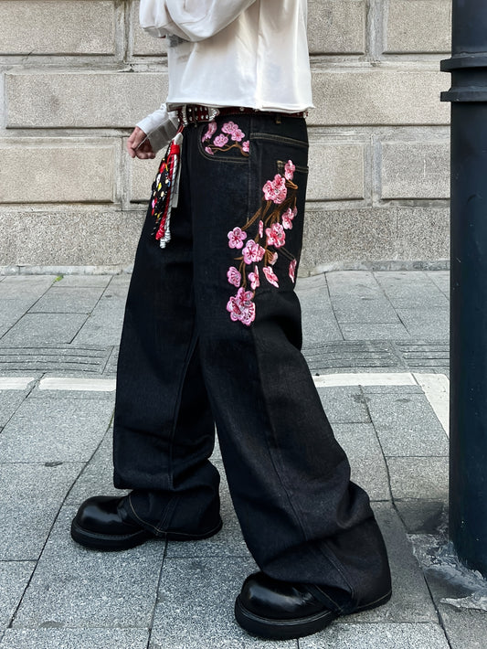 1pc American Vintage Heavy-Duty Plum Blossom Embroidered Loose Denim Jeans | Street Fashion, Unisex, Black, Non-Stretch Fabric, Regular Length, Pocket Details, All-Season