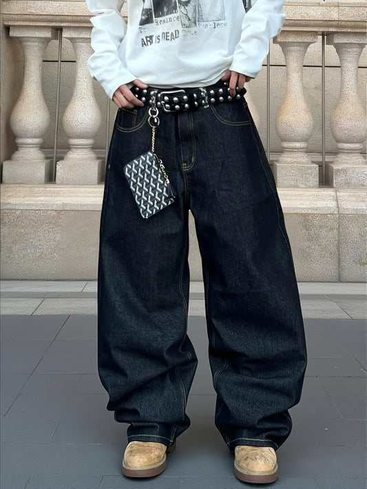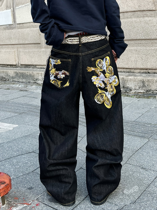 1pc American Vintage Heavy-Duty Golden Embroidered Loose Denim Jeans | Street Hip-Hop Fashion, Non-Stretch Fabric, Regular Length, All-Season, Pocket Details, Belt Not Included
