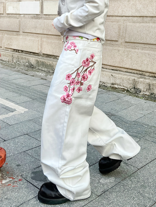 1 Pair of Men's White Loose-fit Denim Jeans, Featuring Artistic Plum Blossom Embroidery and a Workwear-inspired Relaxed Straight-leg Vintage Casual Trouser. Y2K Hip-hop American-style Fashion Denim Pants, Versatile Wide-leg A
