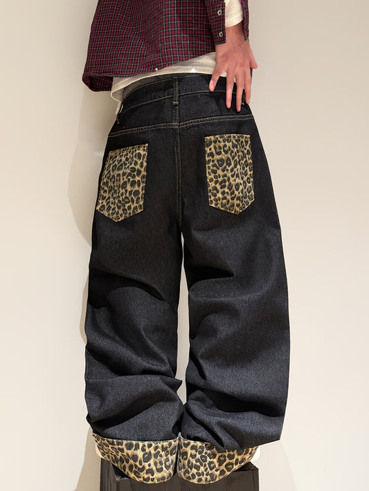 American Retro Style Leopard Print Cuffed Loose Denim Pants, Trendy Streetwear Black Wide-Leg Trousers for Men (Belt And Additions Not Included)